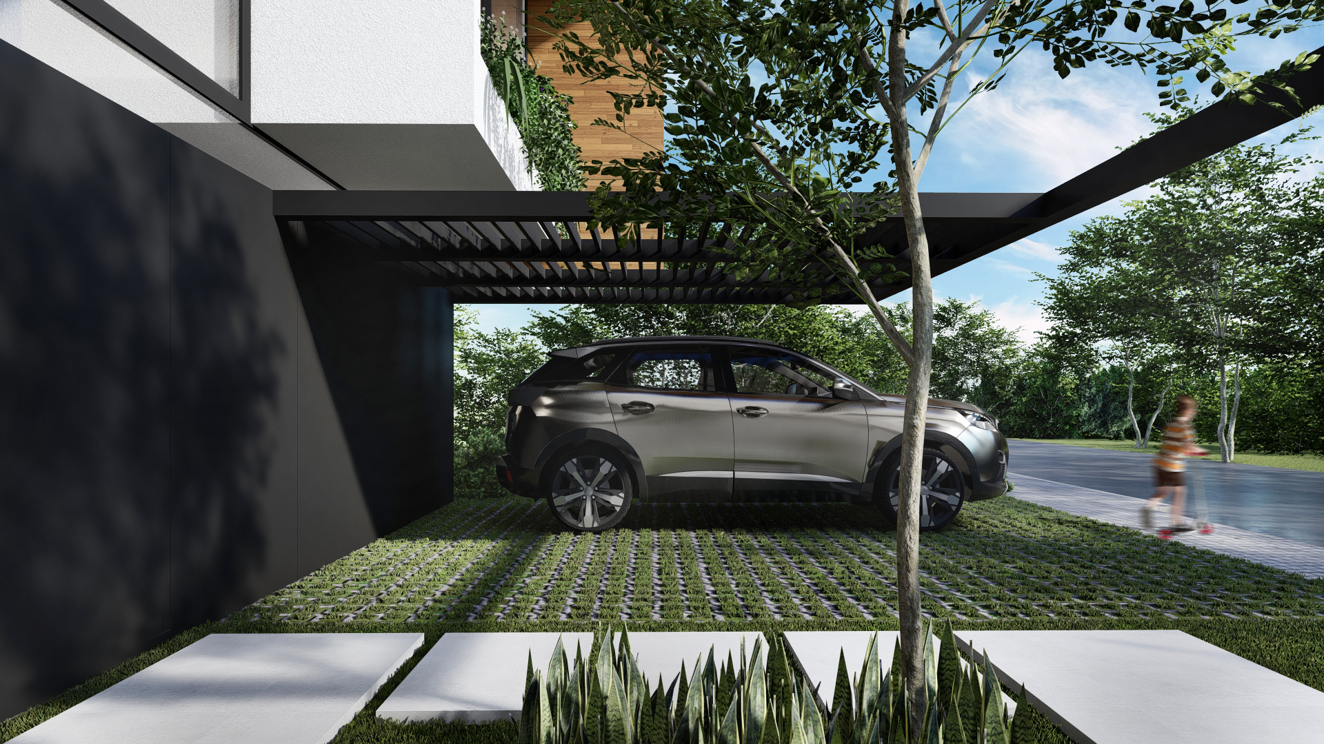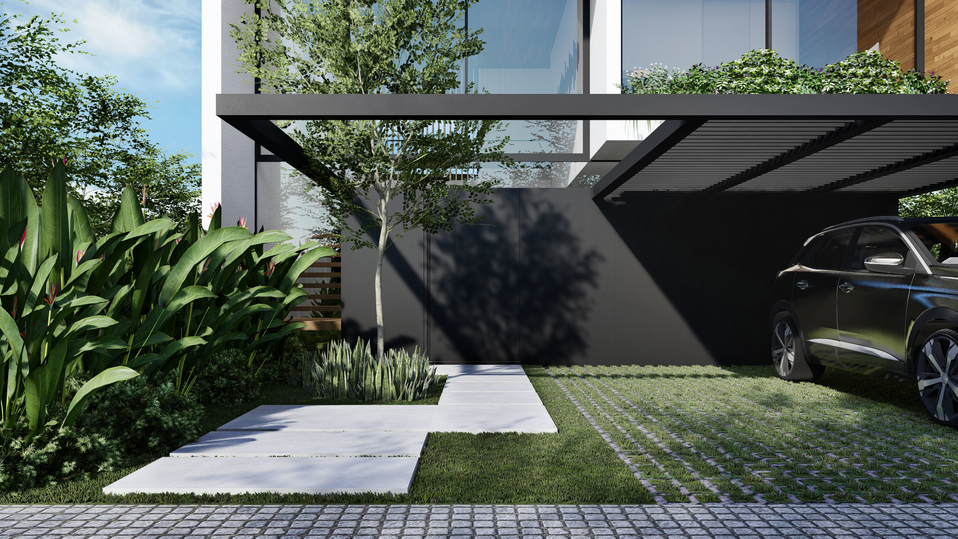 No acesso social, o percurso em placas de concreto conduz à porta mimetizada, que confunde-se com o painel em aço revestindo o volume do térreo, criando unidade e solidez. O pergolado avança sobre o pátio externo funcionando como cobertura leve para a garagem e ao mesmo tempo dando abertura para que o paisagismo cresça e abrace a arquitetura, demarcando o acesso social e estendendo a proximidade da casa com o entorno e sua escala.