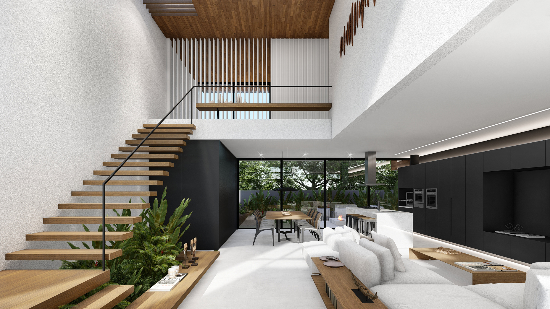 O projeto de interiores, em diálogo constante com a arquitetura, empresta fluidez à disposição dos espaços. No mezanino, o ripado surge como elemento de transição sutil entre os ambientes, e as grandes aberturas permitem o jogo de luz e transparência em toda a área social.