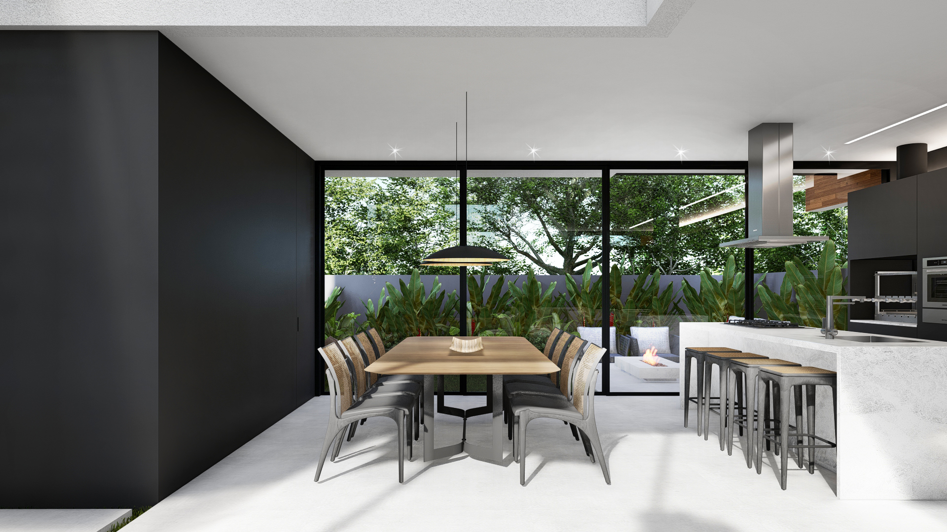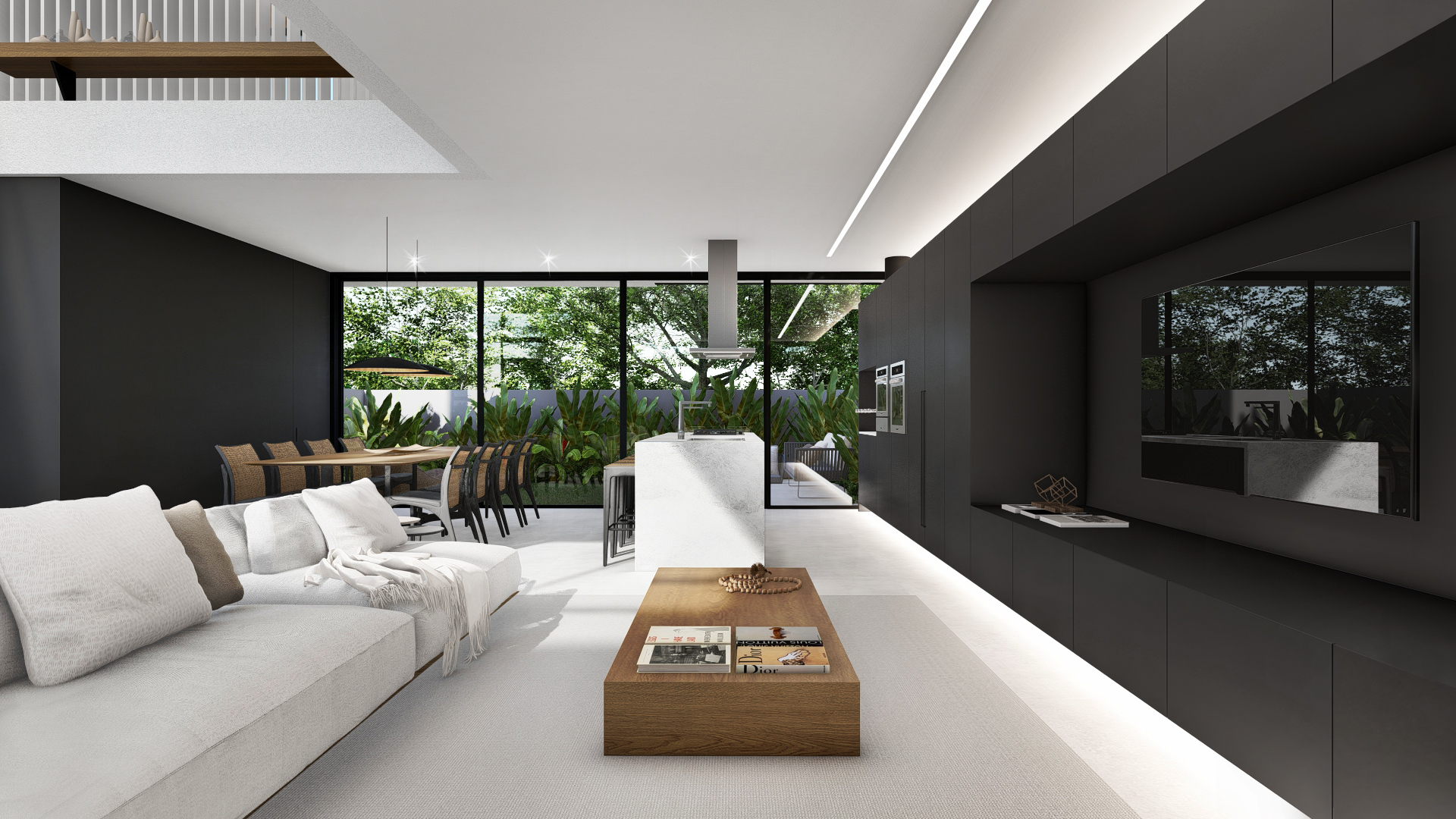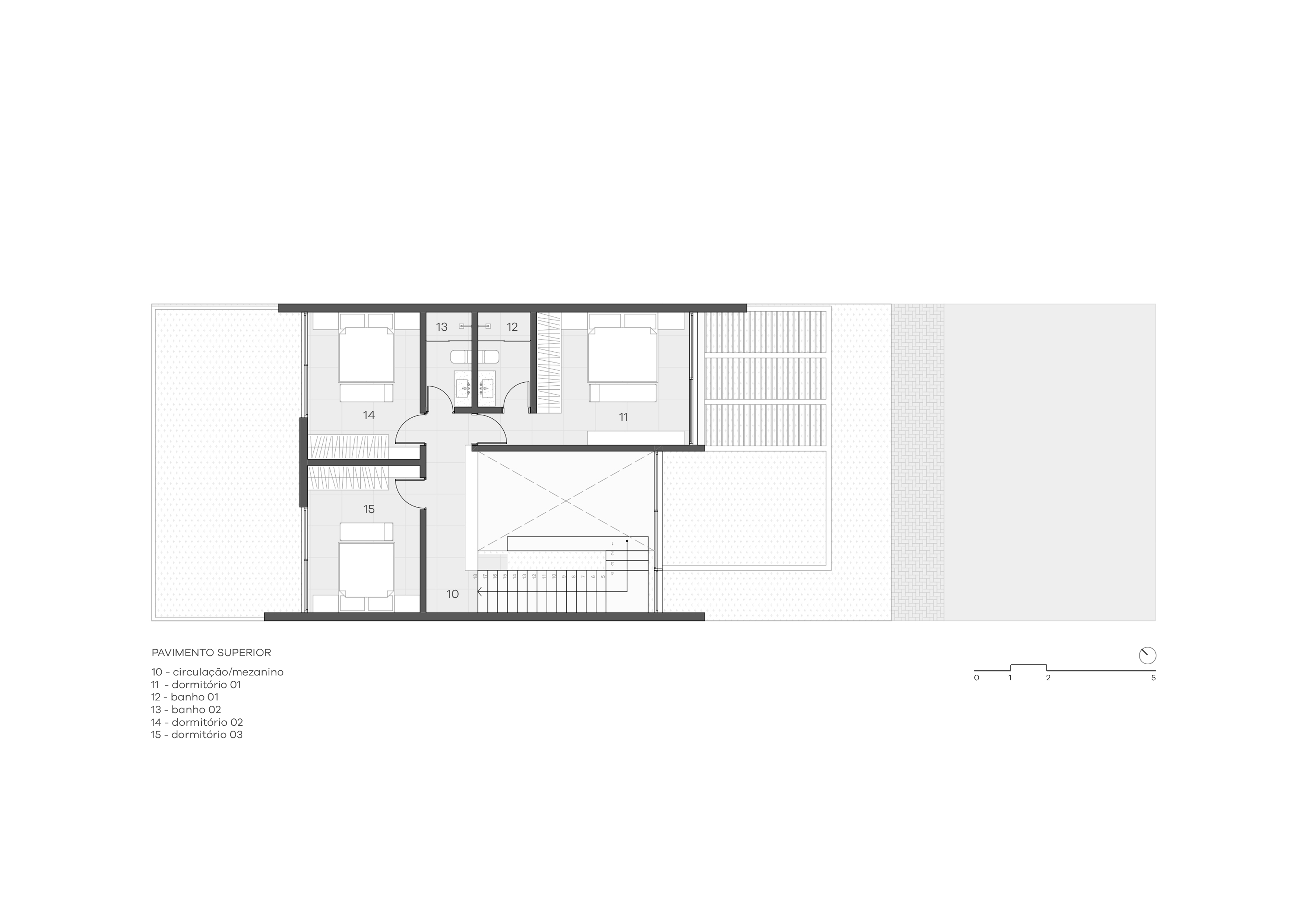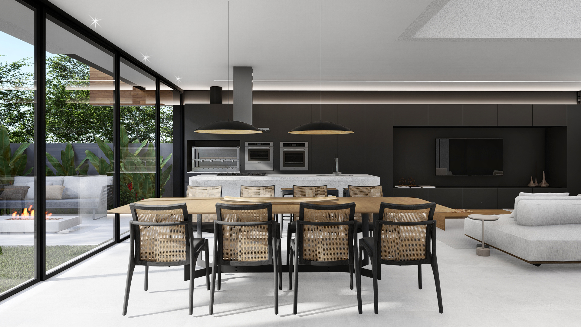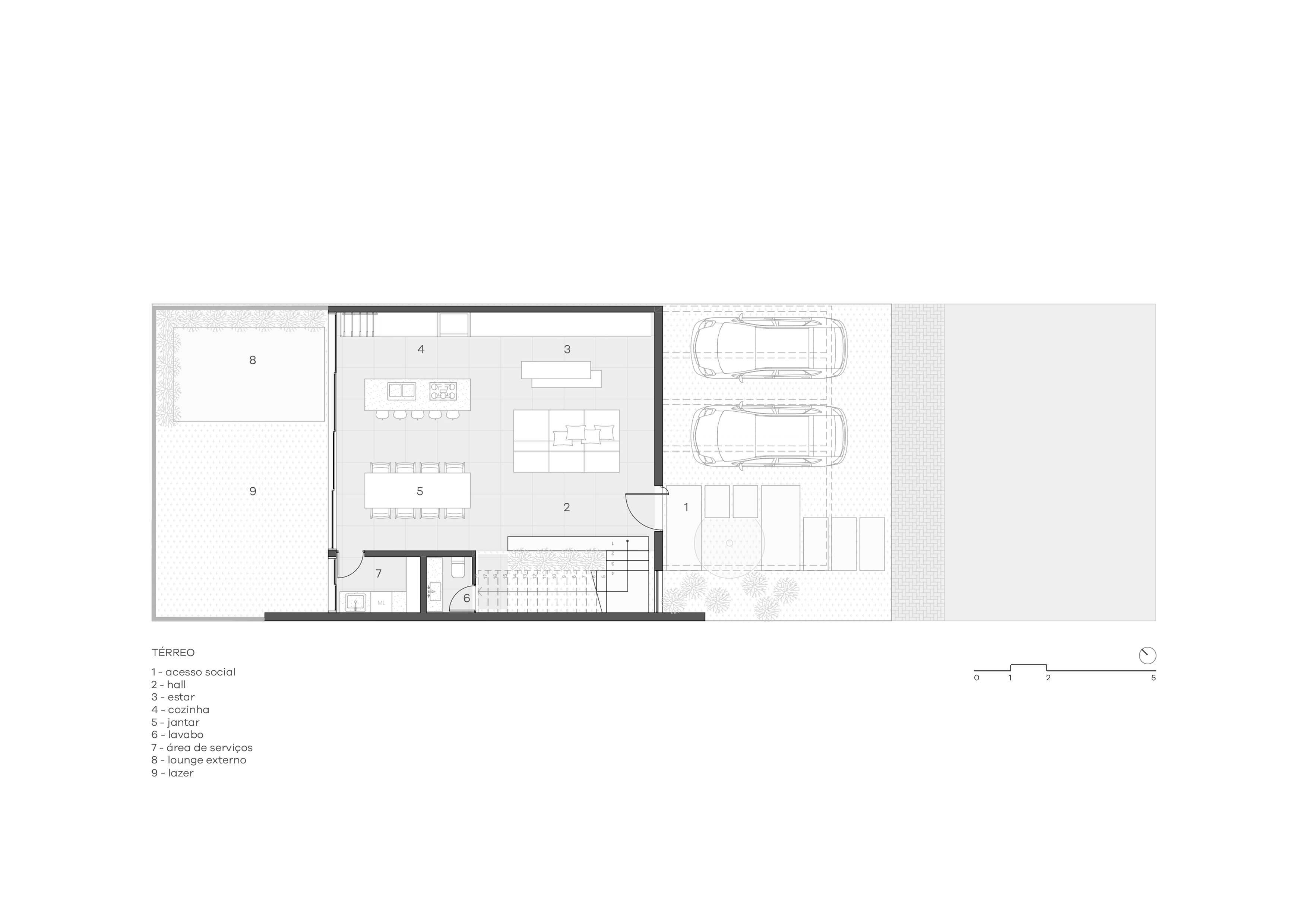 A casa, em sua espacialidade, é um convite ao encontro da família, com ambientes que permitam conexões visuais em todo seu panorama, sobretudo na relação contínua entre a arquitetura, o terreno, o entorno e as rotinas para as quais a relação entre todos esses tópicos converge.