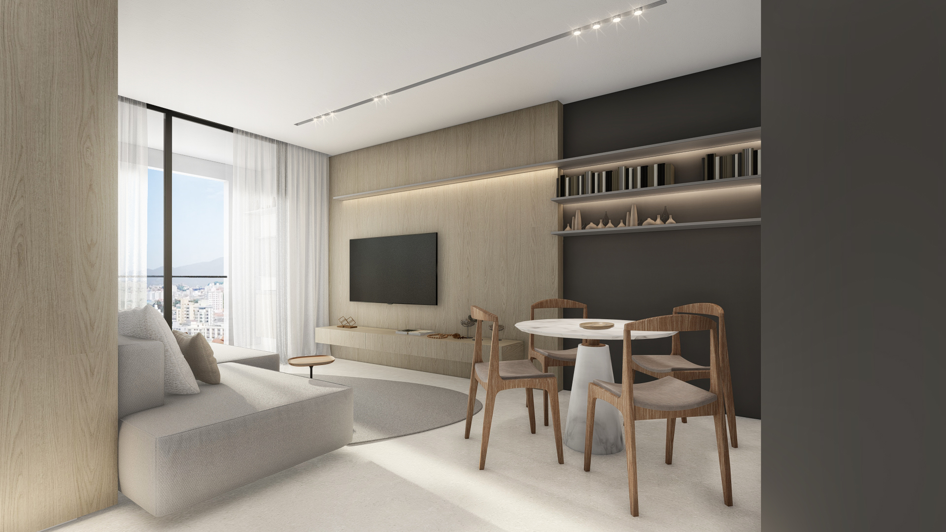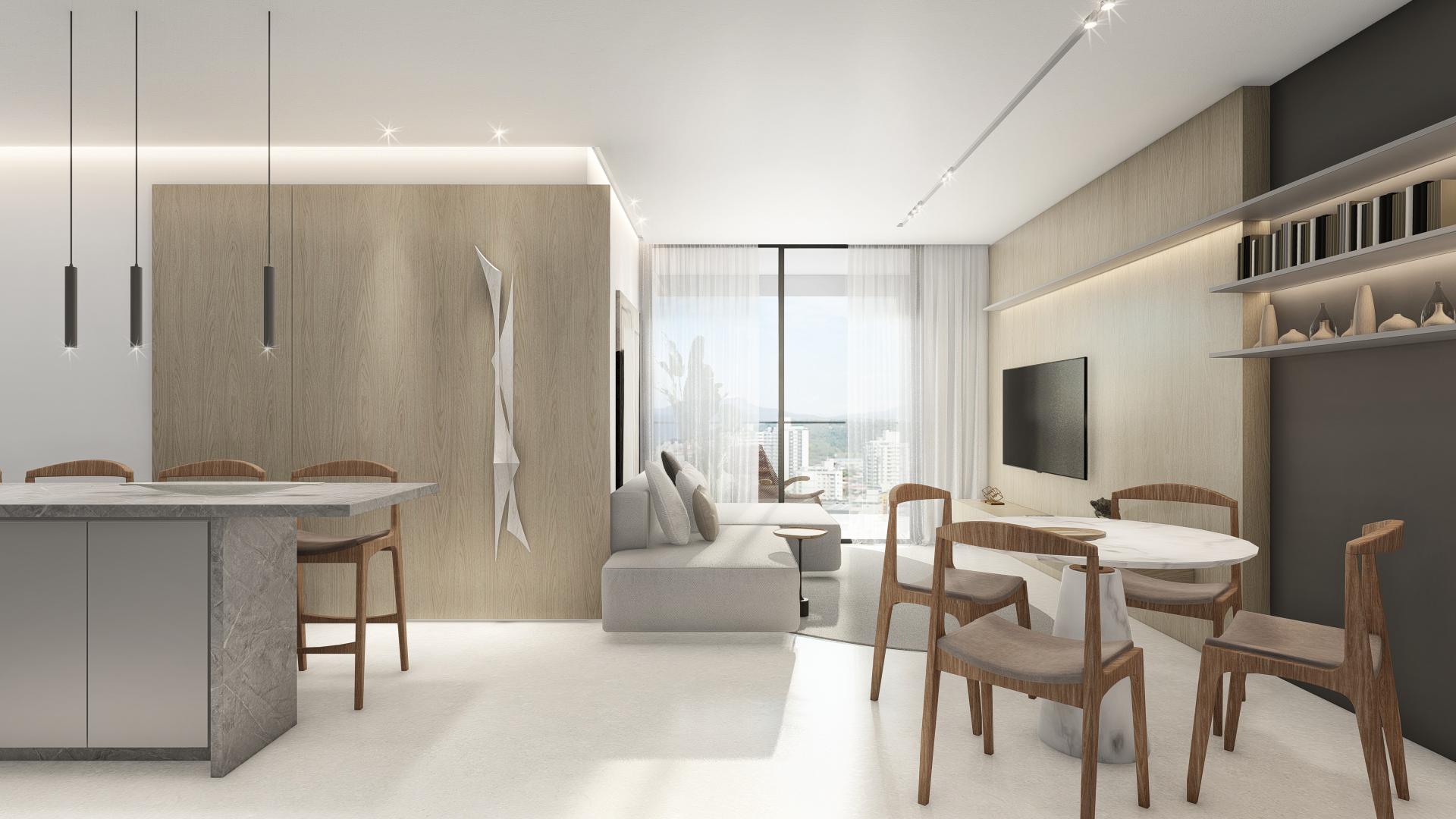 A escultura em madeira recepciona quem acessa o apartamento e intermeia o espaço de estar, cozinha e circulação. A proximidade com a luz natural empresta o protagonismo à sala de estar, embora em toda a linguagem do projeto, em linhas delicadas, esteja assegurada a unidade visual em seu panorama.