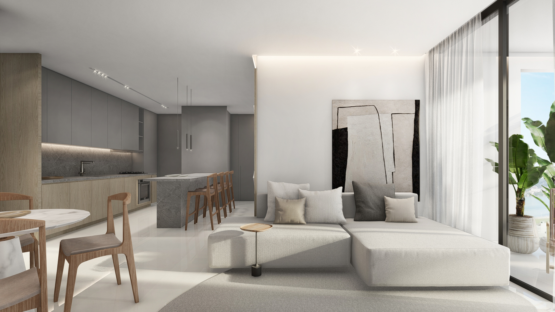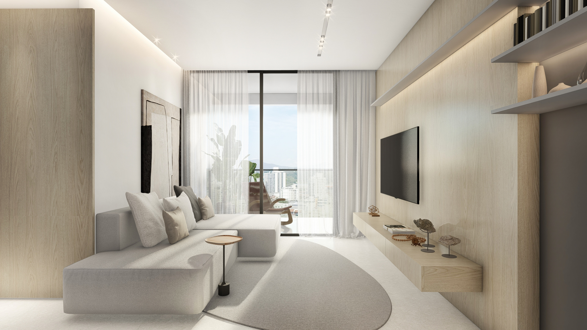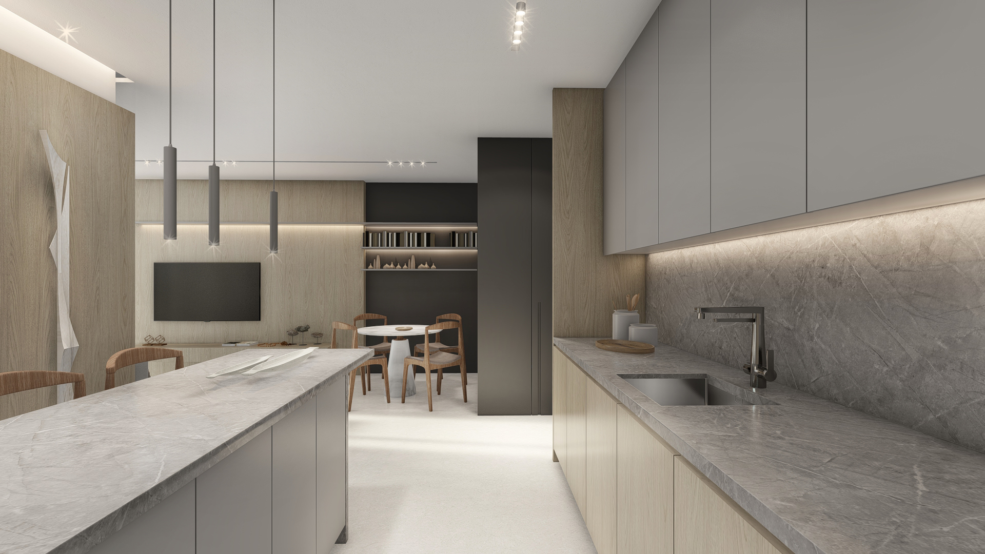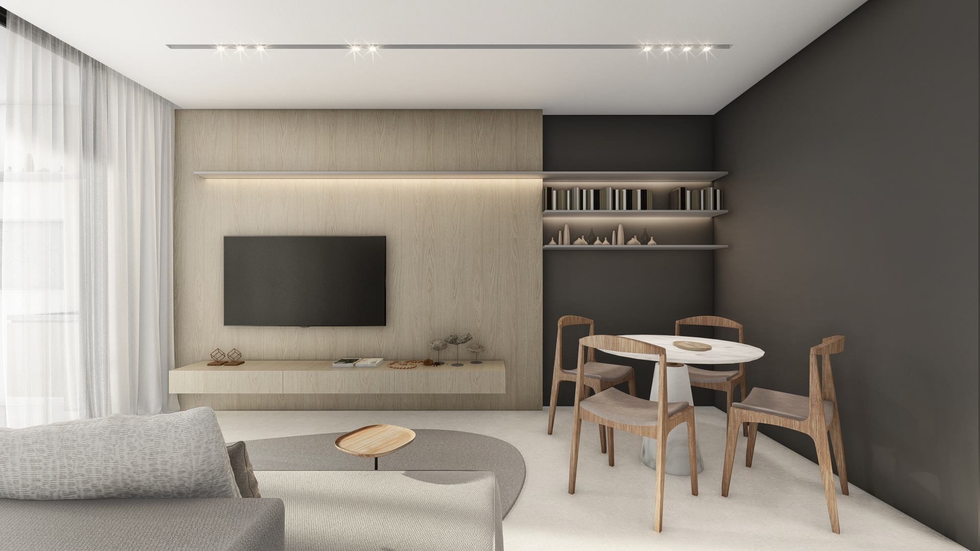 Os tons claros no piso e painéis, em contraste com a sobriedade das escalas de cinza deste projeto, evidenciam a intenção minimalista e o conceito da proposta em todos os elementos, das marcenarias à escolha do mobiliário e decoração.