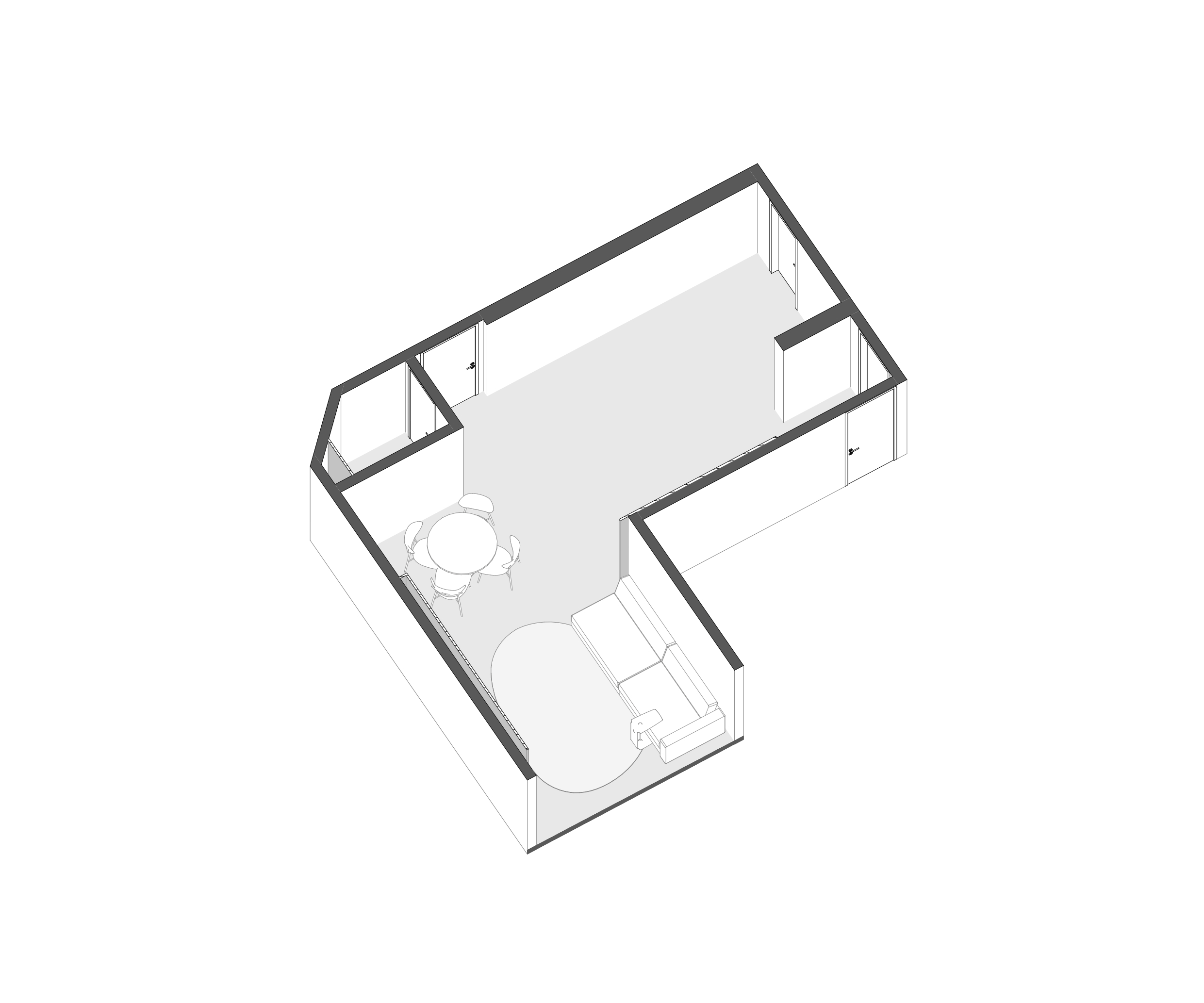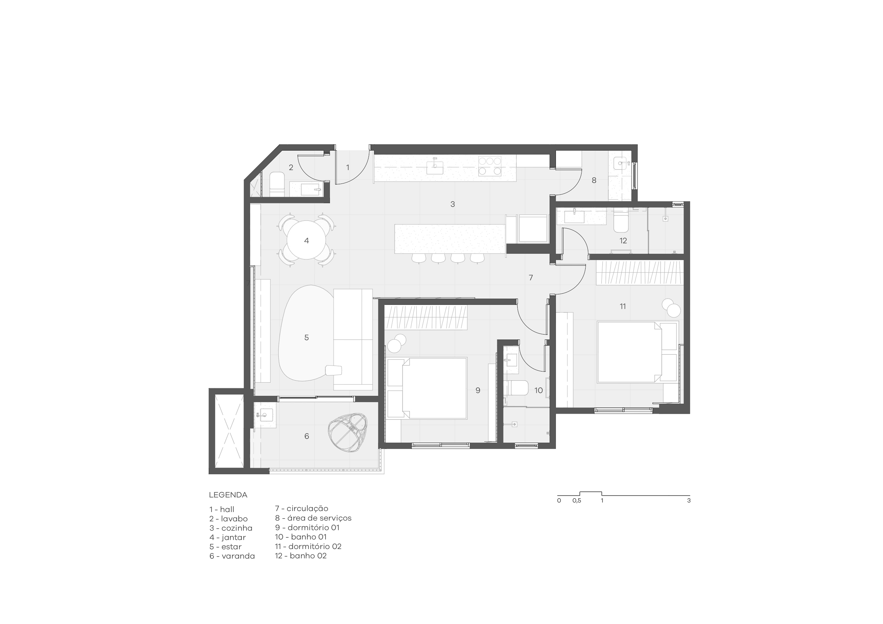 O acesso discreto ao lavabo e a transição gradual entre o social e o acesso aos dormitórios (bancada da cozinha favorecendo este espaço de transição) garantem uma melhor relação entre os usos sem abrir mão da qualidade de integração das áreas em evidência.